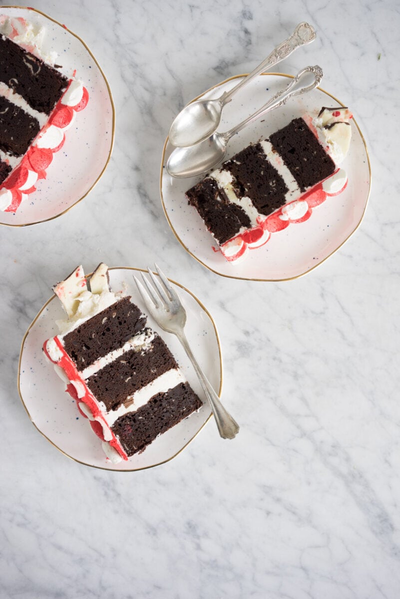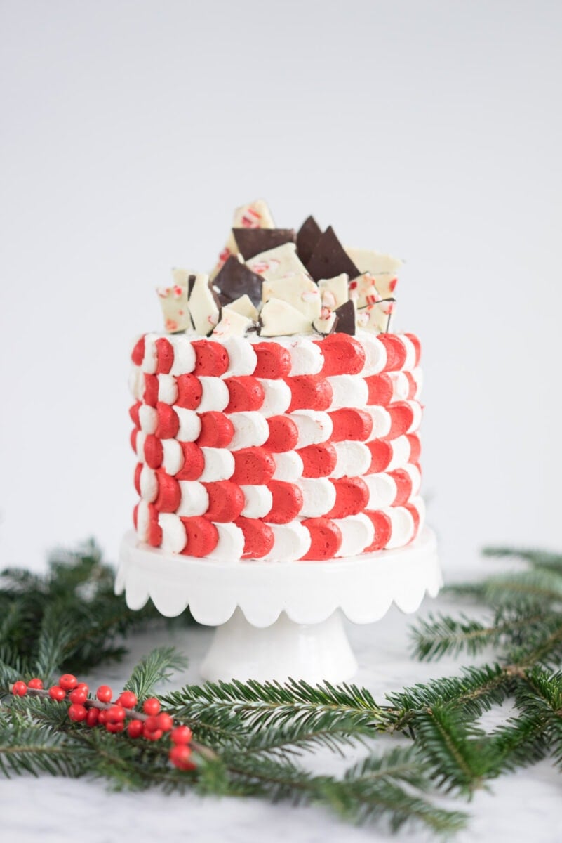 - Decorate the top of the cake with shards of peppermint bark.