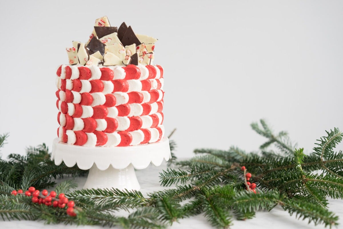 - Place the first of the leveled cakes on a turntable. Spread an even layer of white buttercream over the top of the layer, and sprinkle over a handful of crushed peppermint bark. Place the second layer on top, and repeat the process. Place the final layer of cake on and ensure that the layers are even and level. Coat the cake with a thin layer of buttercream to act as a crumb coat. Chill for approximately an hour to let the crumb coat set.