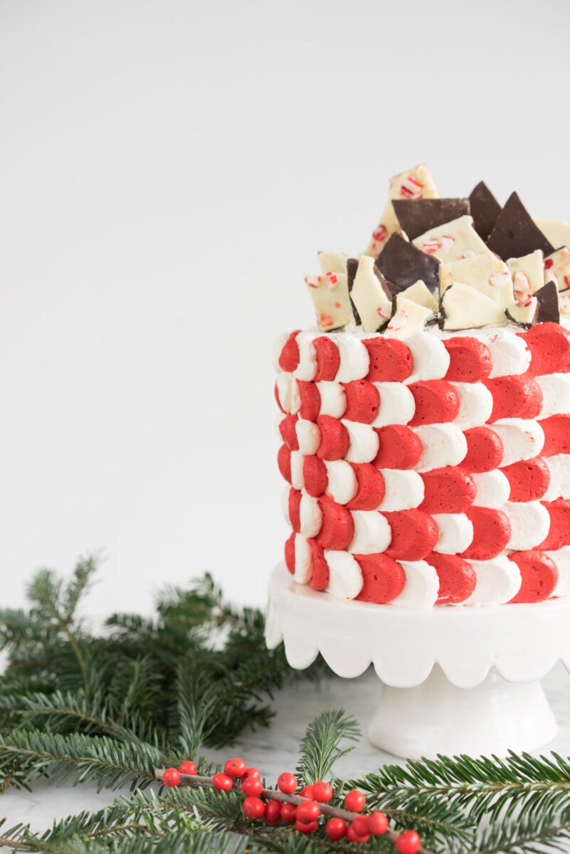 And what better way to highlight peppermint and chocolate than with more peppermint and chocolate? I paired the bark with a super rich brownie cake, layered with Italian buttercream and crushed bark, and finished with bark shards on the top! This would be perfect to take to a holiday party or to serve on Christmas day. The richness of the brownie means that you only need to have a little bit, making this perfect to feed a crowd! (or you know, just eat by yourself!)