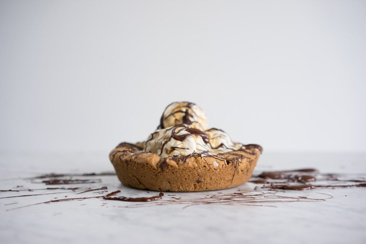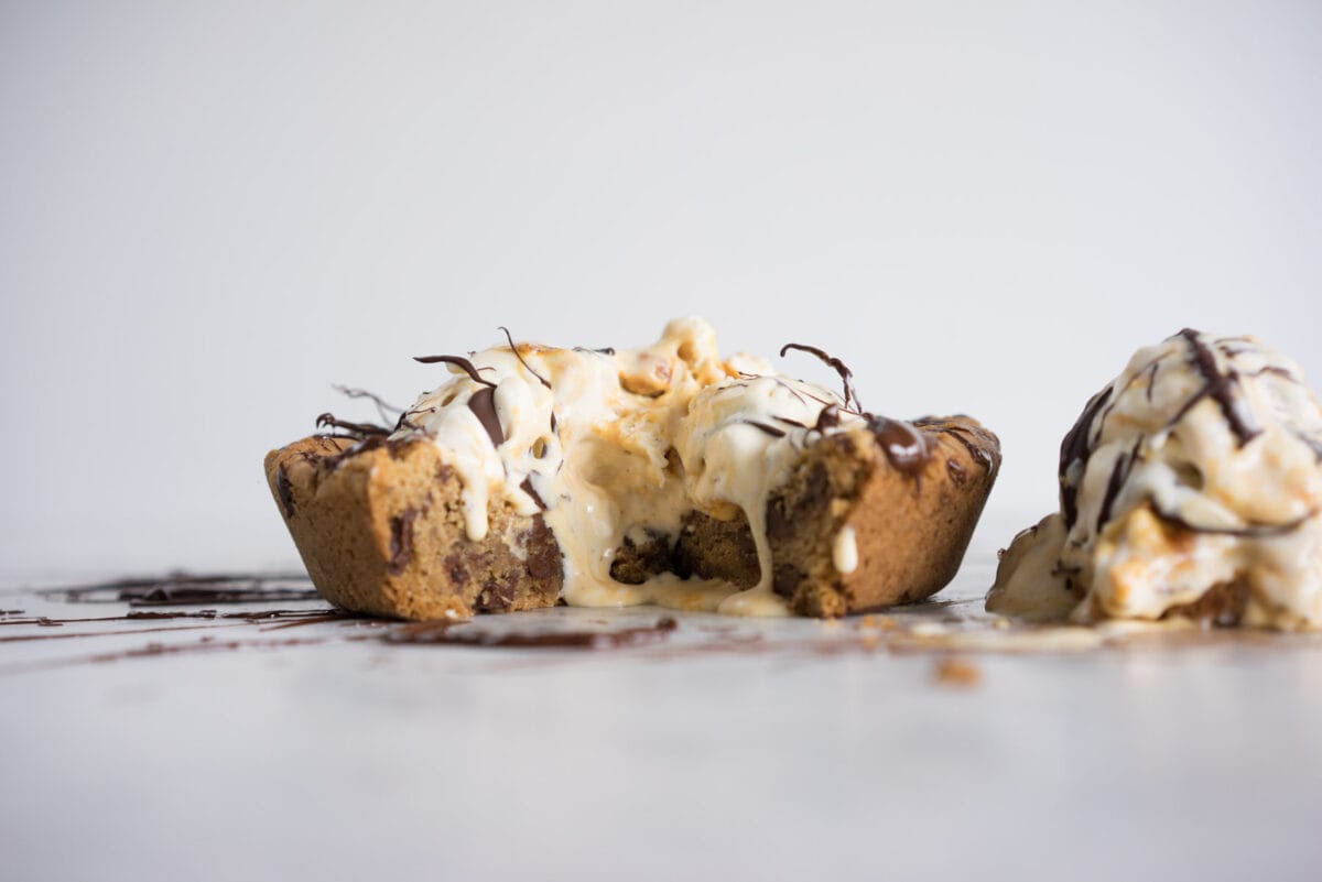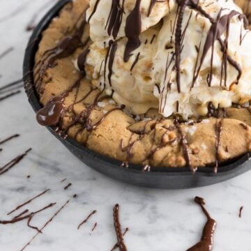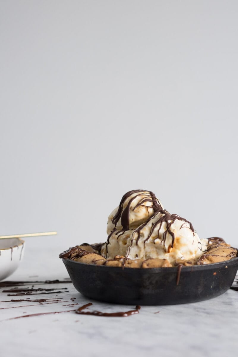 - Carefully remove from oven, allow to cool slightly, and serve warm with a scoop of ice cream, and your choice of sauce! (Melted chocolate works super well, or salted caramel would be AMAZING!)