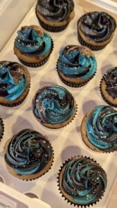 The first time that we made space themed cupcakes, Richard was given the job of colouring the icing. I didn't realise that he had gone hard on the black food colouring until everyone who ate a cupcake ended up with black teeth. Thankfully nobody minded. However I have tweaked the recipe slightly, using black cocoa powder in the black part of the icing rather than food colouring. If you can't get your hands on black cocoa powder (its just super dutched cocoa, the stuff that they use to make oreos!), you can use black food colouring, just be aware that it takes a LOT to achieve a true 'black'.