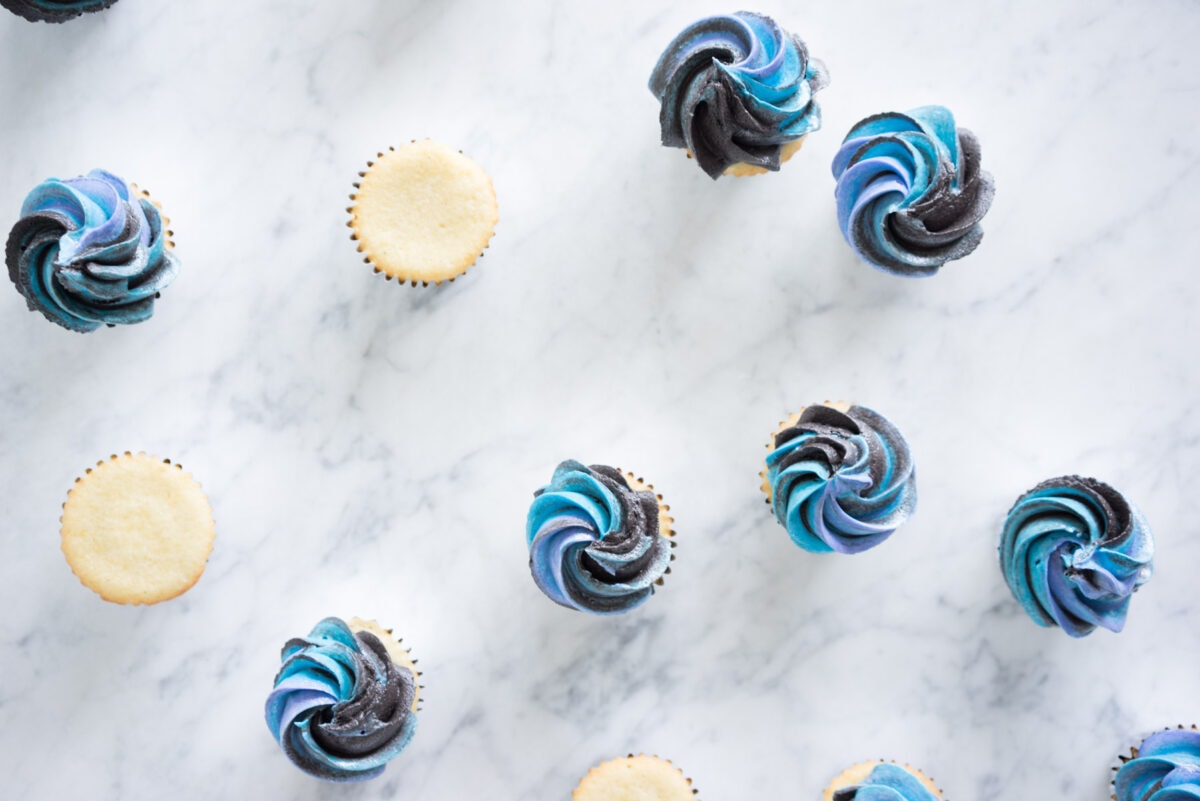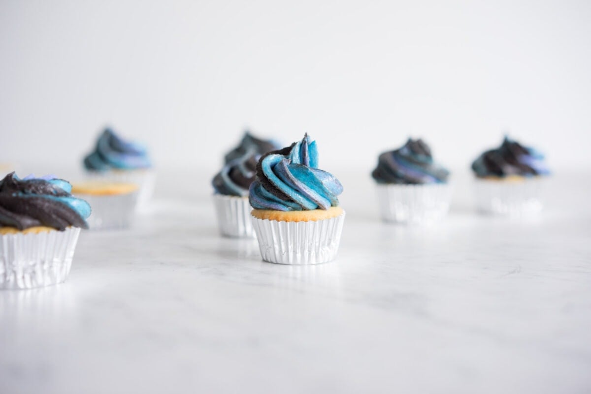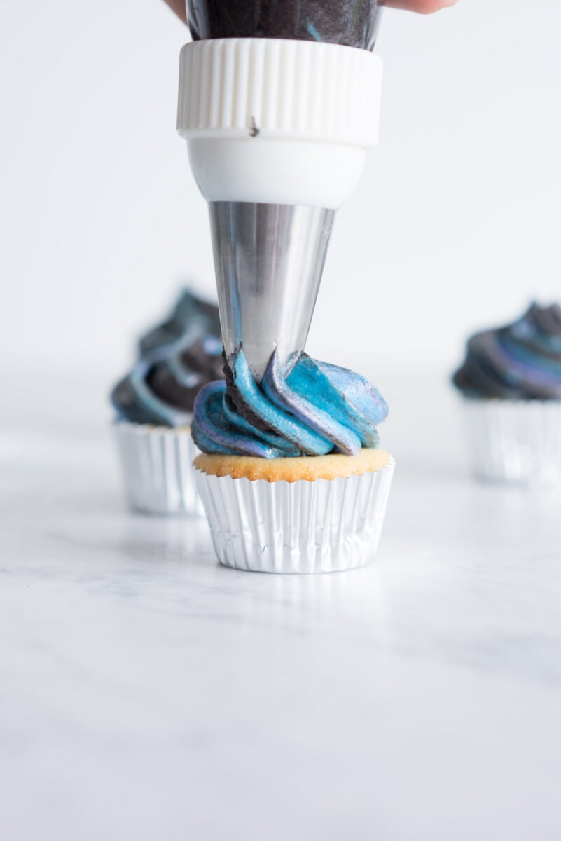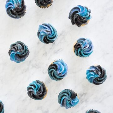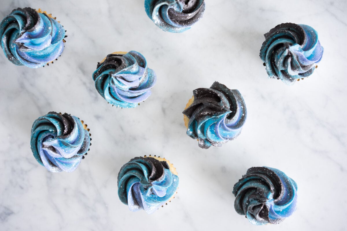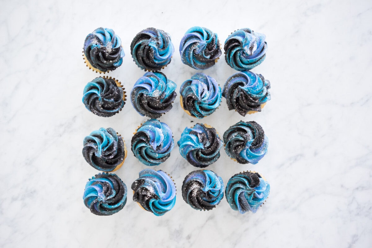 Easy Vanilla Bean Cupcakes topped with Galaxy Style American Buttercream frosting. These are the perfect space themed cupcakes!