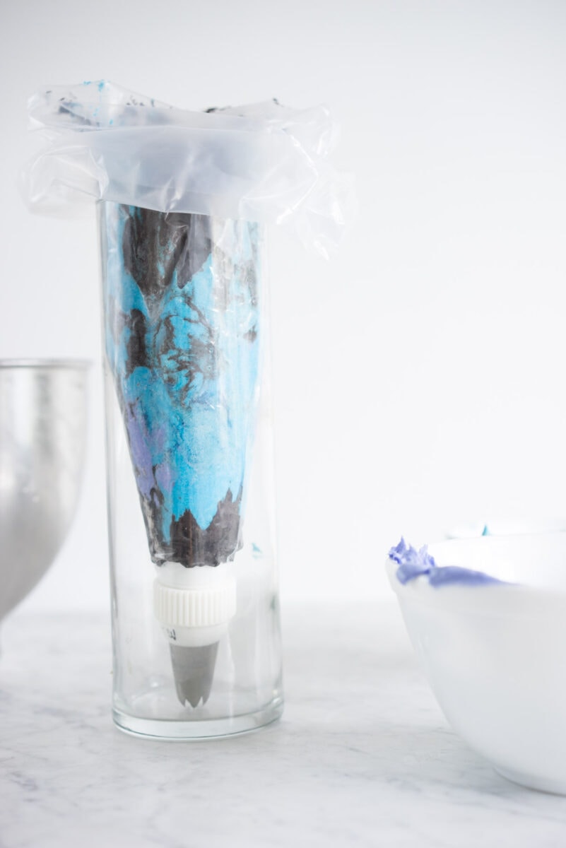 - Divide the buttercream between three bowls, and tint each with the desired 'galaxy' colour using gel food colouring