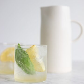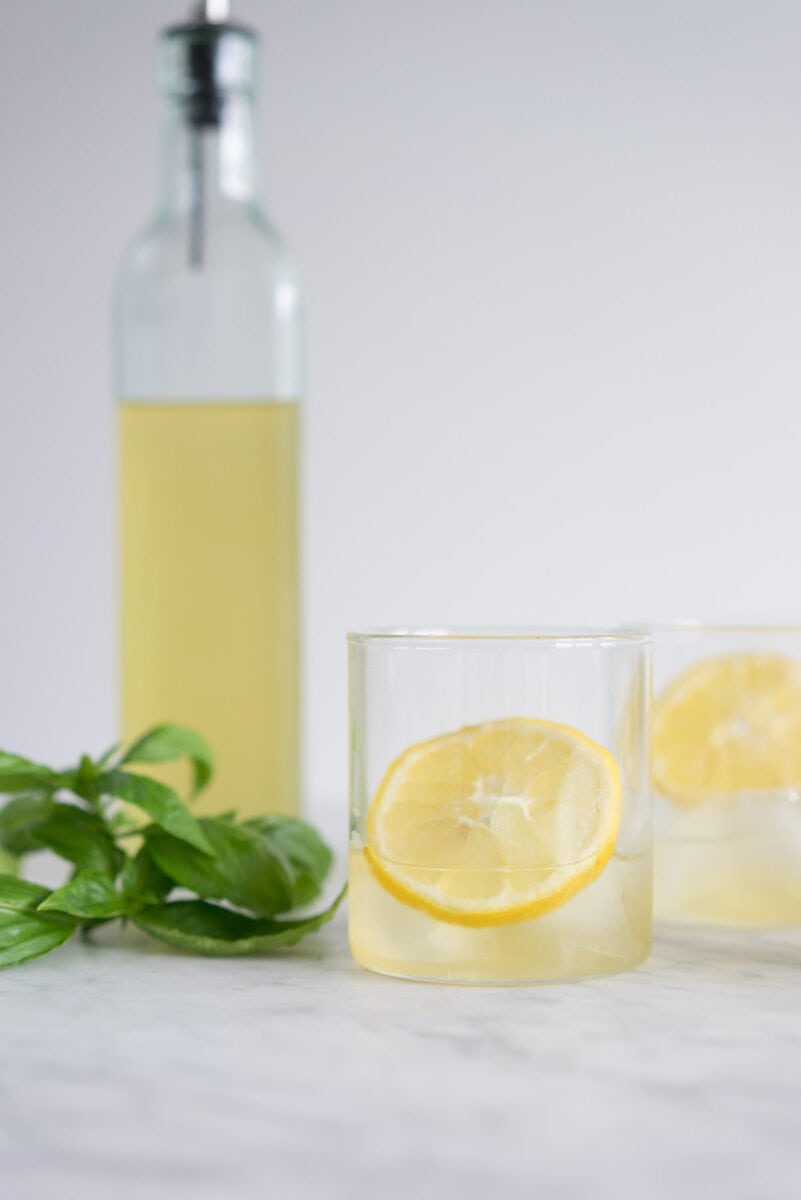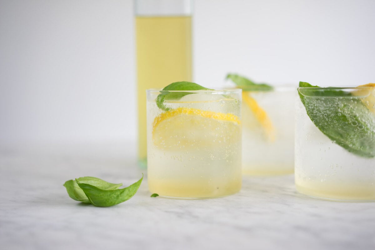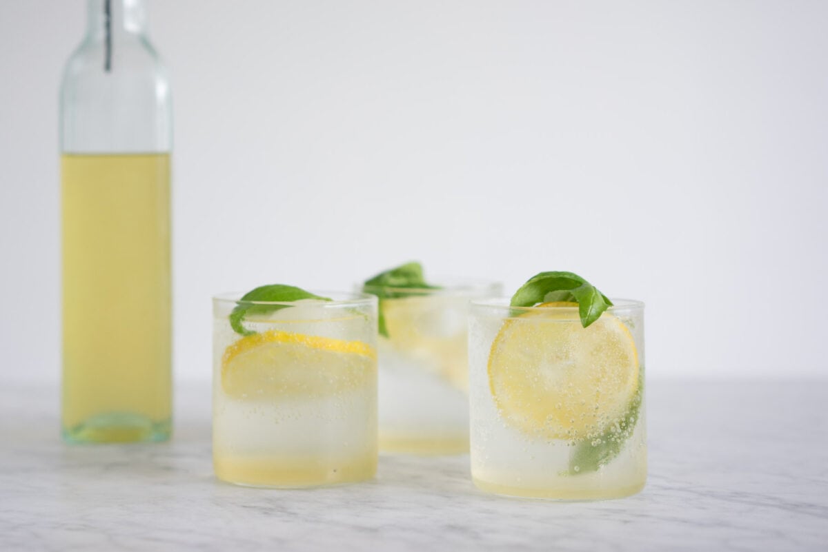 - To serve, fill a glass with ice cubes. Add about a tablespoon of lemon basil syrup (you can adjust this to taste), and top up with soda water. Garnish with lemon slices and basil leaves.