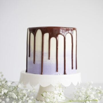 I finished it off with a ganache drip, which I infused with more lavender. I love drip cakes but somehow never get around to doing them. I find that making sure the cake is very well chilled and the ganache a little more set than you think it needs to be always helps. Allow a good two hours to set your cake before you add the ganache drip, or under-compensate when you are adding them, because they will drip further down than you expect!