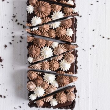 This is a simple chocolate tart - there is a press-in crust made with home made chocolate sugar cookies. It gets chilled for a hot second, then filled with a silky ganache (seriously, I can, and do eat this stuff with a spoon). You can keep it plain, but I infused it with a little earl grey because I couldn't help myself. The taste of the tea is very subtle, but I love it. You can stop here if you like, and have an epic chocolate tart, or you can keep going and get all fancy with some swiss meringue buttercream ombre blobs, which take it up just a notch. The ombre is made by making one batch of buttercream, then removing some, adding a little dark chocolate, removing a little more, more chocolate, etc etc. It's all piped on using a star tip (my secret weapon), and then we have ourselves a show stopping dessert! It can be made well in advance, and would be perfect for a holiday dinner party or dessert table. Merry Merry from Me and Mine to You and Yours! Stay safe these holidays! xx