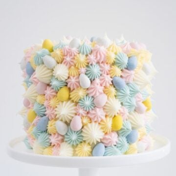 - Pipe 'blobs' of buttercream over the surface of the cake - start with a few big blobs of one colour, and then go in with each colour to fill in the gaps. Continue until the sides and top of the cake are covered. Add easter eggs where you see fit.