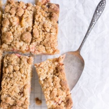 - Spread the batter evenly in the bottom of your lined pan. In a separate bowl, toss the rhubarb and peaches together with the brown sugar (see notes), and spread this mixture on top of the cake batter. Gently press the fruit into the batter a bit. Crumble the brown butter streusel evenly on top of the fruit and place the pan in the preheated oven. Bake for about 45-55 minutes, or until a cake tester inserted comes out clean (See notes). Allow to cool slightly before eating. Cake will keep best at room temperature, covered tightly in plastic wrap.
