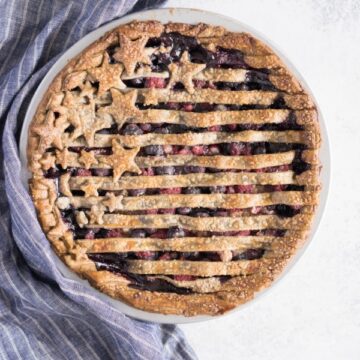 - Divide the second disc of dough into ⅔ of ⅓ of the disc. Roll out the ⅔ portion into a rectangle. Using a pastry wheel or multi-wheel cutter (which are the best ever), cut strips approx ¾ inch wide, or your desired lattice width. Place the strips over the filling, leaving a small gap between. Roll out the second portion of dough, and cut out stars using cutters. Arrange as desired on the pie. Trim the edges of the pie so that they are flush with the pie dish. Alternatively, decorate with your favourite lattice pattern.