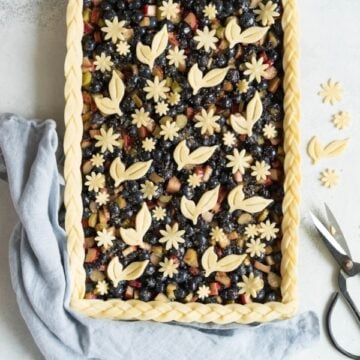Carrying on from last year's yesterbirthday pie, I figured it was only fair that we make it happen again and it become a birthday tradition! On our expeditions around the farm stands we picked up some blueberries, and I was super excited to find some rhubarb, so a blueberry rhubarb pie was definitely on the cards. I have been meaning to make a slab pie for a long time now - they are pretty quick and easy to throw together, and are perfect for feeding a crowd. We got a little fancy and added a braided edge and some stamped cut-outs, but it would be just as amazing with a simple lattice on the top. We fluffed around in the kitchen making and shooting this yesterday, then ate slices of it, still warm, loaded with vanilla ice-cream. The best. The filling was jammy and not too sweet, and set up perfectly. Deffo making more slab pies. You should too.