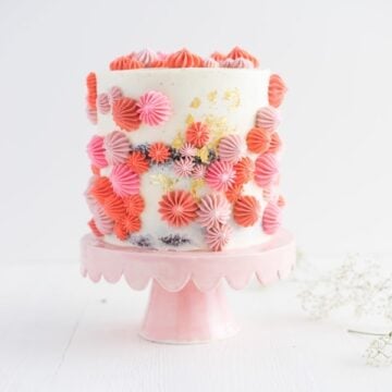 - Smooth an rough layer of buttercream all over the top and sides of the cake using an offset spatula, and smooth using an icing smoother. You can go for a fully covered effect, or leave it semi naked as I did. Place in the fridge for 20 minutes to chill. While the cake is chilling, divide the remaining buttercream between four bowls, and colour each various shades of pink using gel food colouring. Transfer each colour to a piping bag fitted with a french star tip.