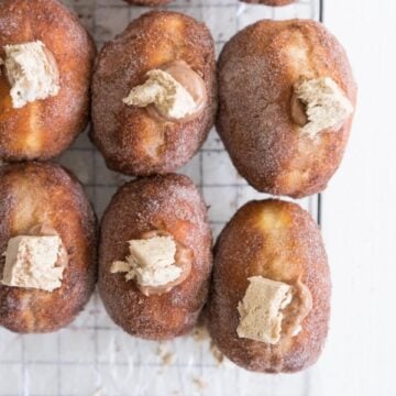 - Transfer the pastry cream to a piping bag fitted with a round piping tip. Fill each doughnut with pastry cream - you will feel it become heavier in your hand. Pipe a little blob on top of each doughnut, and top with a chunk of halva.