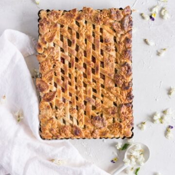 - Brush the pie with egg wash, and sprinkle liberally with raw sugar. Bake at 425˚f / 220˚c for 20 minutes, or until the pastry is set and beginning to go golden. Reduce the temperature 375˚f / 190˚c, and bake until the pastry is deeply golden and the filling is bubbling.