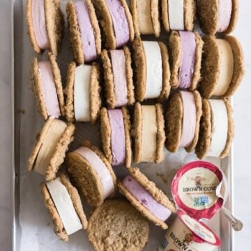 One thing I wasn't able to nail with my ice cream maker though, was frozen yogurt (Or frozen yoghurt, we spell it differently in NZ!). I always had issues with it being too icy, or having a weird texture once it was frozen. This year I decided I wasn't going to let it get the better of me, and set out to nail the perfect frozen yogurt cookie sandwich. And I had the best base to start with - Brown Cow Yogurt. Brown Cow Yogurt is delicious and creamy, with this dreamy layer of cream on the surface of the yogurt. It comes in loads of different flavours, and it's creamy texture makes it perfect for the smoothest, tangiest, creamiest frozen yogurt.