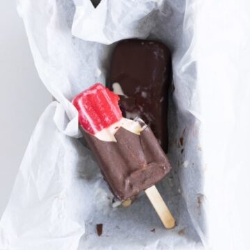 - The recipe for the chocolate shell makes quite a lot - the reason for this is that you need to have enough of it to dip the ice creams into it completely. I put it in a narrow mason jar (make sure the ice cream pop will fit in), so that when I dipped in the ice cream pop, it displaced the chocolate shell enough to cover the whole pop nicely. You can keep the extra in the jar and re-heat when needed to serve as chocolate shell on your leftover ice cream 😉