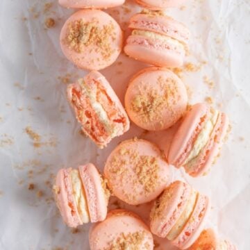 We wanted to go for a bit of a peach cobbler vibe, so toped the shells of the macs with a brown butter streusel. The toasty streusel paired perfectly with the chewy shell and the fruity buttercream, to create the most delicious little bite! I do hope you give these a try - they are so, so good! I can't wait to add the streusel / roasted peach german buttercream to a whole lot of things this summer!