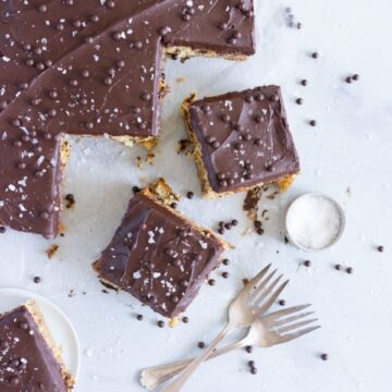 - Dump the ganache onto the cooled cake, spread with an offset spatula, and sprinkle with chocolate pearls and flaky sea salt. Slice into squares to serve. Store leftovers in an airtight container.