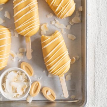 - Working with one at a time, dip an ice cream pop into the jar of magic shell, ensuring that it is evenly coated. Allow any excess to drip off, then place back onto the sheet pan in the freezer (I like to do this near the freezer, only bringing one pop out at a time). Repeat with the remaining pops until all are coated. Allow to sit in the freezer for another 10 minutes to firm up completely before drizzling with melted white chocolate. If needed, add a little grape seed oil to the white chocolate to help make it easier to drizzle.