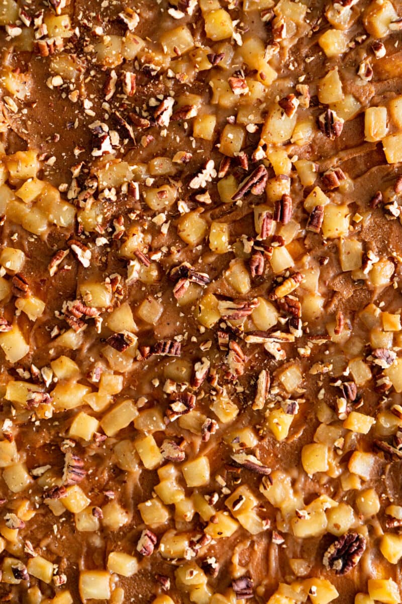 - Top with the prepared apple pie filling. Spread the apple pie filling out evenly. Roughly chop the toasted pecans, and spread over the apple filling.