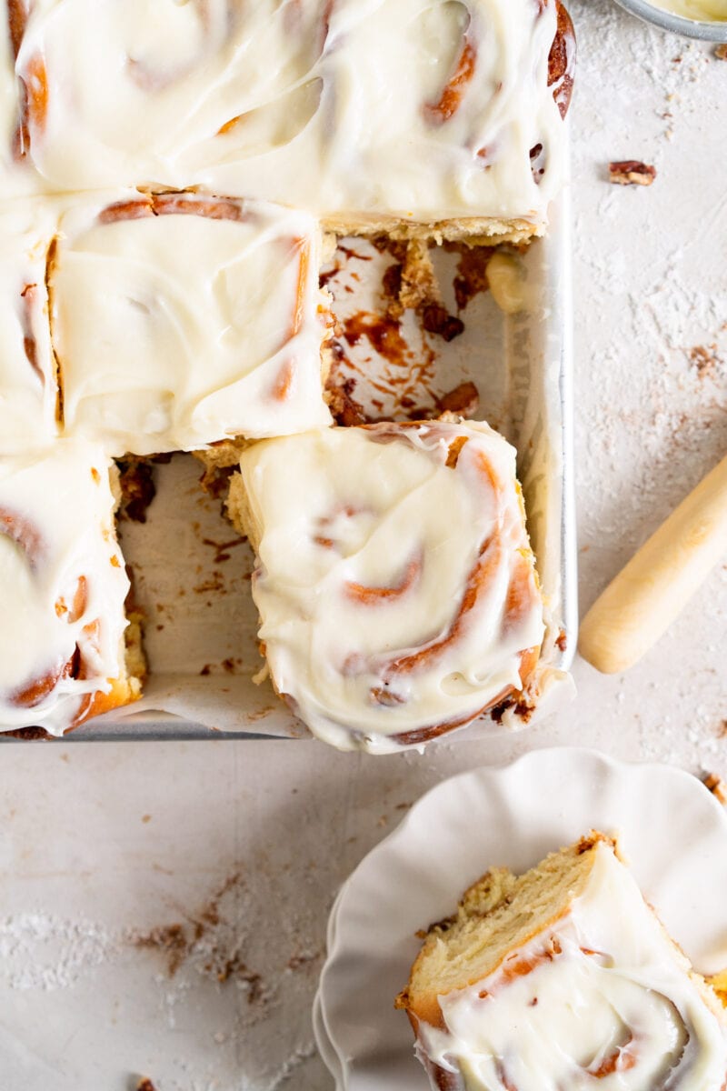 - These are pretty gooey cinnamon rolls, so make sure that the pan you use will help keep them contained. I used a quarter sheet pan and it was only just enough to hold them in - a 9"x13" baking pan would work great.