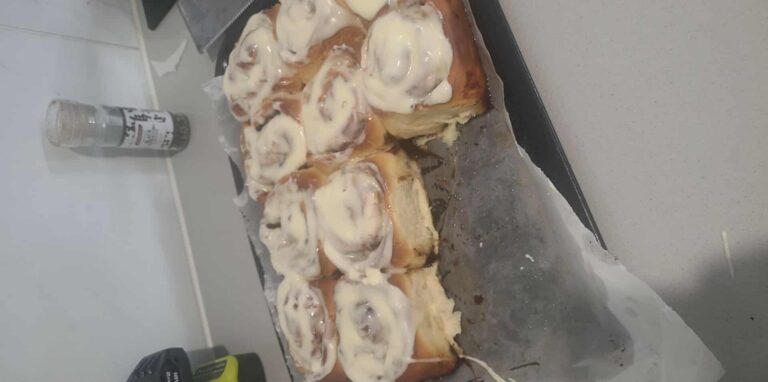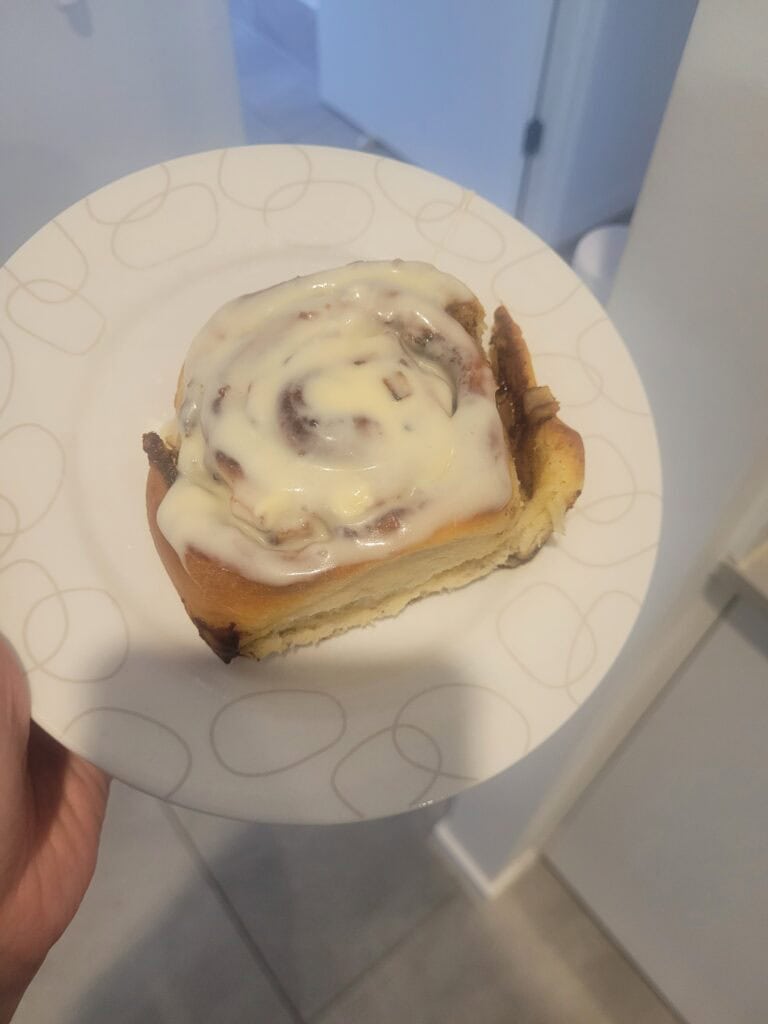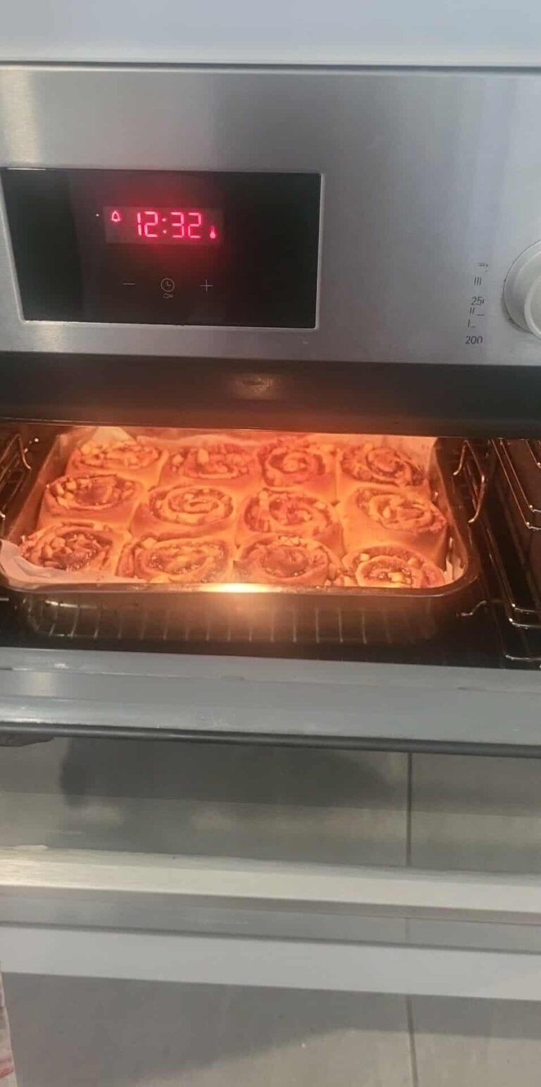 - Bake the Cinnamon Rolls off and prepare the cream cheese frosting while they are in the oven.