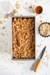 - Make the crumble. Preheat the oven to 350°f/180°c. Lightly grease an 8” (20cm) square pan or similar sized dish. In a medium bowl, whisk together the almond meal, all-purpose flour, and cinnamon to remove any lumps. Add the old fashioned oats, dark brown sugar, turbinado sugar, and salt, and mix to combine. Add the butter cubes and using your fingers, rub the butter into the mixture until combined and crumbly. Set aside in the fridge until ready to use.