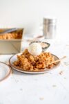 There are a few ways that you can make Apple Crumble ahead of time. If you are making it on the same day as you are planning to serve, I like to just assemble the whole thing, then cover with foil and place into the fridge until I am ready to bake it. You may need to add on 5 or so minutes with the foil on (so increase to 25 min) to account for the cold fruit, but this works perfectly and I have done it loads of times.