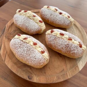 A baked version of the New Zealand Classic Bakery jam doughnut. A fluffy soft brioche bun is filled with piped sweetened whipped cream and raspberry jam.