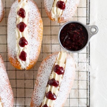Cream Buns with Vanilla Bean Whipped Cream and Raspberry Jam. A baked version of the New Zealand Classic Bakery jam doughnut. A fluffy soft brioche bun is filled with piped sweetened whipped cream and raspberry jam.