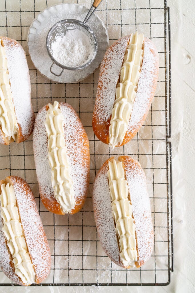 - I filled these ‘bakery style’ with fancy looking piping. If you want to just fill with cream either with a spoon or just with a plain round piping tip that works great too! You do you here.