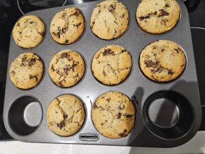 You will notice that there are two temperatures in this banana chocolate chip muffin recipe - an initial higher temperature for the first 10 minutes, then you drop the temperature down for the remainder of the bake time.