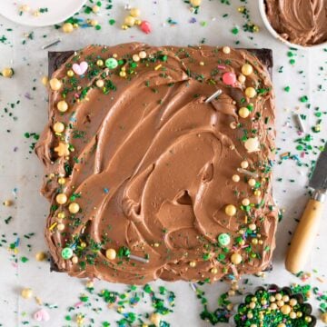 - Spread the buttercream over the surface of the brownie using an offset spatula. Add sprinkles if desired.