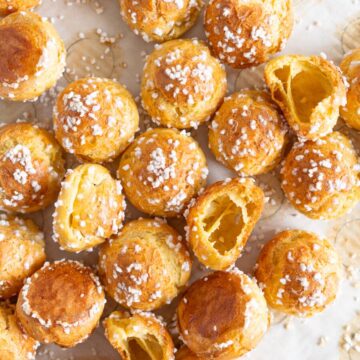 Chouquettes are little choux pastry bites, piped into rounds and finished with pearl sugar before being baked to golden perfection.