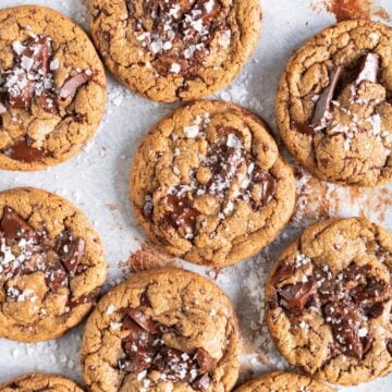 Hi hi! These are a brown butter spelt chocolate chip situation, and while there are already a bunch of cookie recipes here on the site, these brown butter spelt chocolate chip cookies are a very welcome addition to my chocolate chip cookie recipe collection. These Spelt chocolate chip cookies are a riff on my salted caramel chocolate chunk cookies, if you're after a classic chocolate chip cookie recipe, check out my homemade perfect chocolate chip cookies. If you would like a slightly thin and crispy cookie, my brown butter chocolate chip cookie recipe will be your friend!