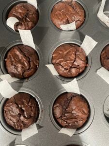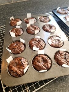 - Portion the brownie batter between the 24 mini muffin cups - I use a #40 cookie scoop and fill them almost to the top. Try to fill each cup evenly but it is not the end of the world if you don’t manage.