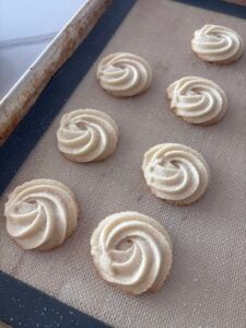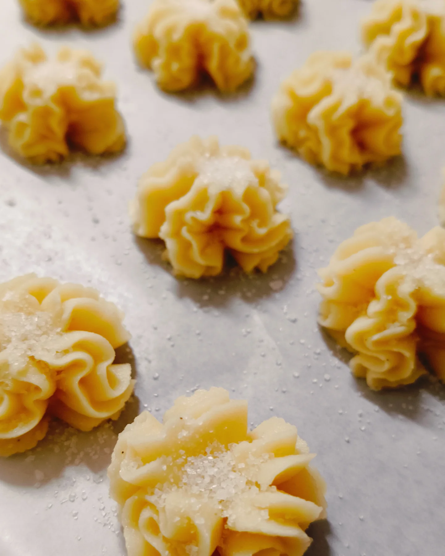 There are a few tips and tricks when it comes to piping out these butter cookies. The first time I did it, I had a total piping bag blowout - which came from the batter being too thick, but also from my piping bag not being sturdy enough.