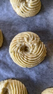 - Pipe out the cookies - I did three rows of five cookies. Pipe each into a rosette - hold the piping bag straight up and down, then using even pressure, pipe a circle of dough until it loops back onto itself, finishing with a little flick of the wrist. The rosettes should be about 4.5cm in diameter but this will depend on the size of your piping tip.