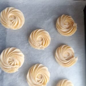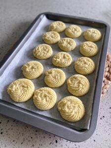 I piped three rows of five cookies - to pipe a rosette, hold the piping bag straight up and down over the surface and pipe a round of the butter cookie dough, finishing when it overlaps on itself. I prefer not to leave a hole in the middle - my rosettes came out at about 4.5cm in diameter. If you have a different sized piping tip or want to pipe them in a different shape you may end up with more or less cookies - make sure that you adjust the baking time if this is the case.