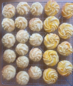 Hi - these were a bit stiff to pipe but eventually I got about 18 or so. At 325, they took about 2x as long as the recommended bake time to finally start to brown. Nice flavor but I am not sure about the texture, maybe due to the cornstarch. Measured everything by weight.