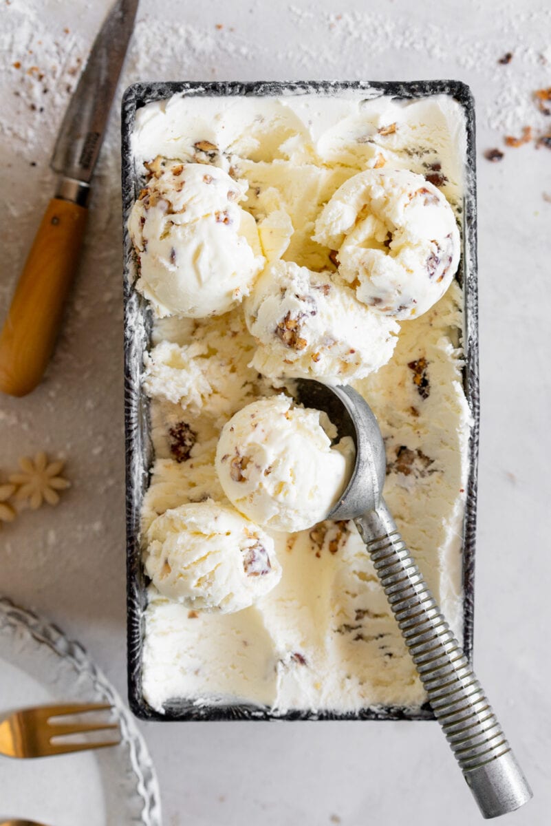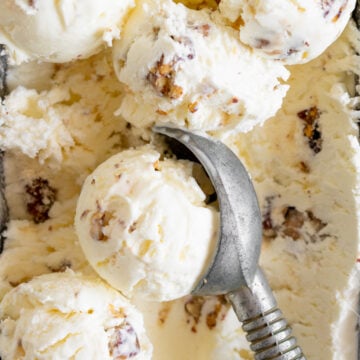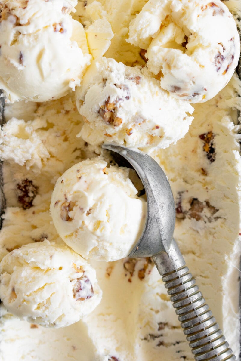 If you wanted to do a more traditional style ice cream base for this butter pecan ice cream, you could use a philadelphia style ice cream base, which uses an ice cream maker but is a super simple egg free recipe that will still let the pecan flavour shine through.