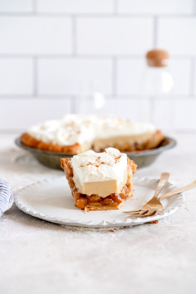 You can either leave the butterscotch pudding layer to set for at least 2 hours, or you can do it the night before and leave it to set overnight. You want to add the cream the day of serving. I prepped the dough the night before, then the next day I par-baked the crust, made the apple filling, cooked it off, then added the butterscotch layer and left it to set overnight. The day that I shot it I just added some whipped cream and cinnamon sprinkle and was ready to go!