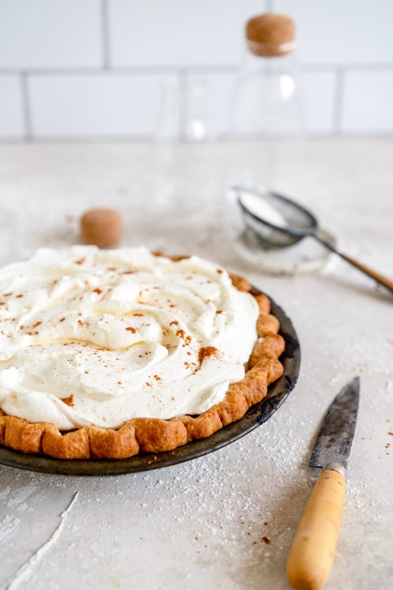 - Spoon, pipe, or spread the whipped cream over the surface of the pie and garnish with cinnamon. Store leftovers in an airtight container in the fridge.