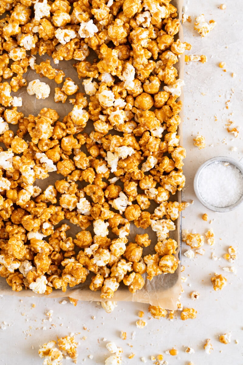 Have your baking soda pre-measured and your popcorn on the sheet pan before starting the caramel as it can go quite quickly.