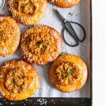 For the filling I kept it pretty simple - I caramelised off some onions, added in some soft, fresh goat cheese, and then hit it with a burst of flavour by way of some tomato pesto. These Pretzel buns would make a perfect light meal, or would be incredible served alongside a soup, or for a little starter or mid day snack. I’m a huge fan, and I hope you are too! x