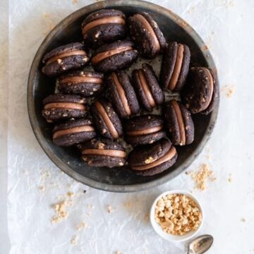 These wee cookies were something that my friend Becky and I dreamt up for Cherry Bombe University last year. We partnered up for a bake-off, and because we live on opposite coasts, decided to divide and conquer our recipe by doing a sandwich cookie, and coming up with one component each. Being our resident internet cookie queen, Becky whipped up these incredible cookies - little brownie cookies with a caramelised white chocolate ‘dust’ swirled throughout. I paired them with my very favourite thing - a salted chocolate german buttercream. Alone, the components are pretty good, but paired up, these cookies are just ridiculous. The cookies are perfectly soft, and sandwiched with the slightly salty, silky buttercream, they are some of the very best cookies I have had in quite some time. Becky came around the morning of the event and we baked our little butts off, filling my teeny apartment with boxes and boxes of cookies - we had to make 200, so kept them on the small side, because making 400 cookies is a whole shitload of cookies. They won crowd favourite at the event, and I promise you they will become your new favourite too.