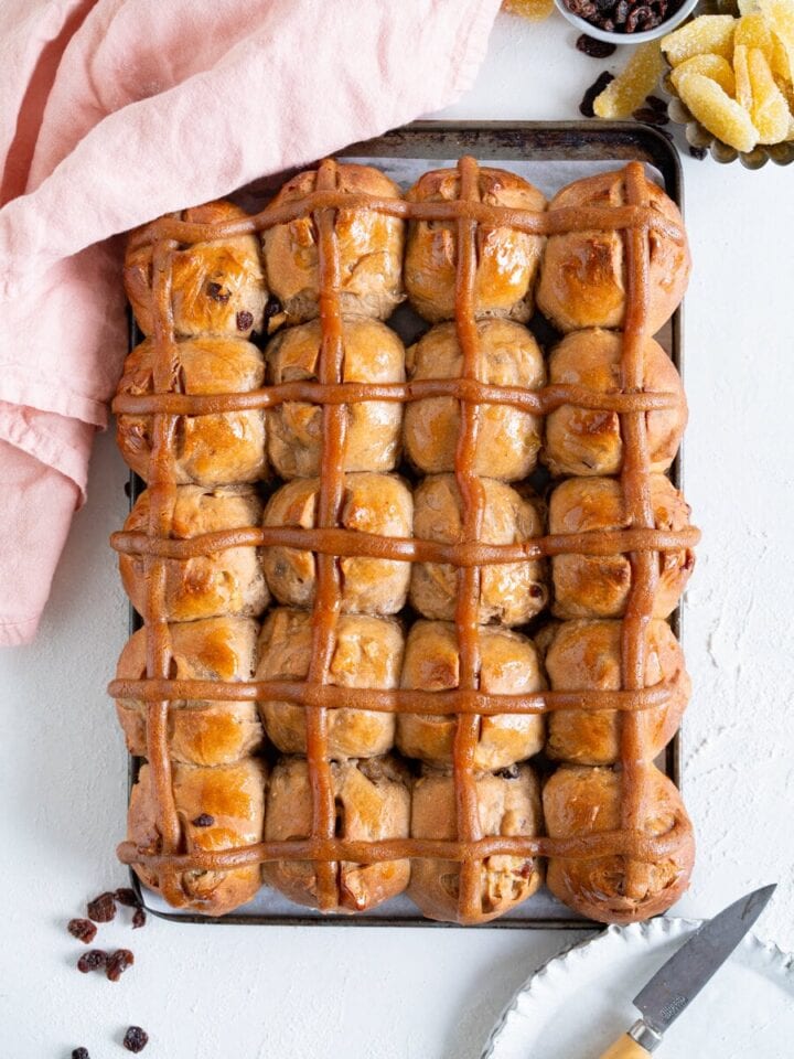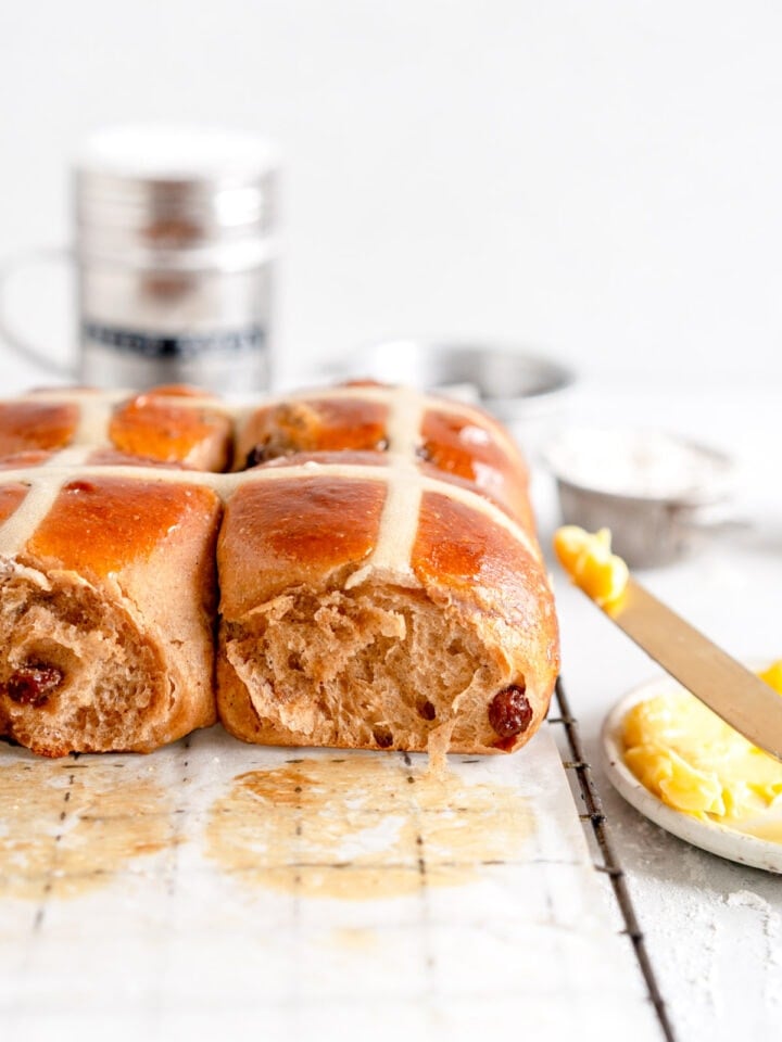 Roasted Apple, Crystallised Ginger, and Sultana Hot Cross Buns with Salted Caramel Crosses