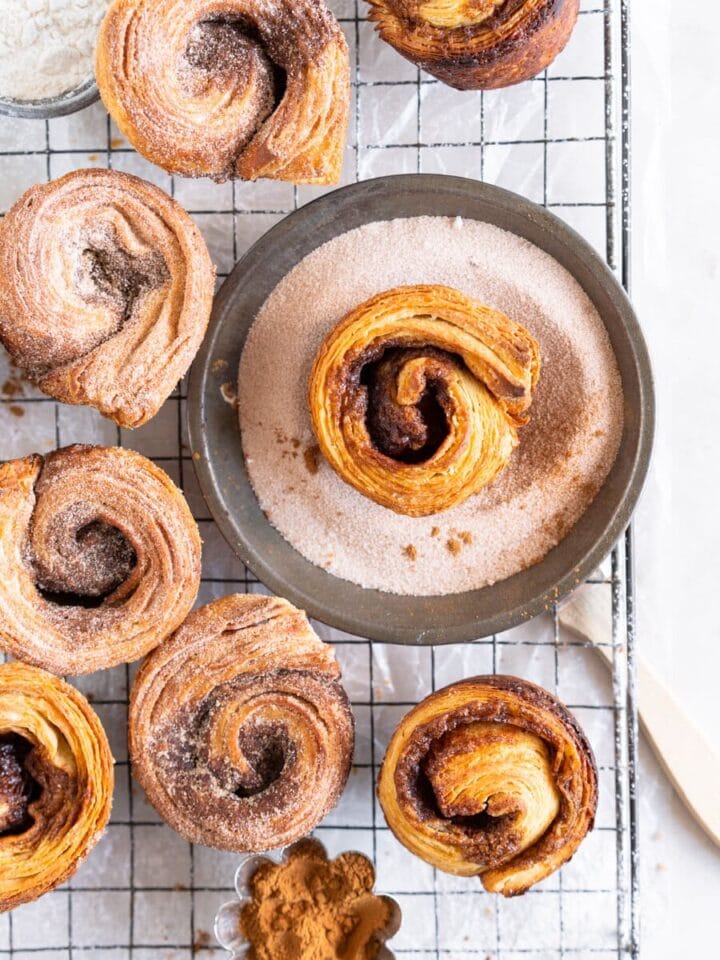 A collection of sweet buns and rolls - laminated brioche buns, cream filled jam buns, pretzel buns, and twists on the traditional cinnamon rolls.