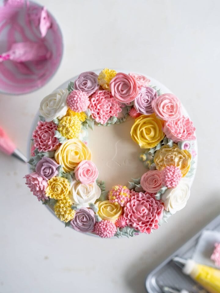 Lavender Blackberry Cake with Cream Cheese Frosting and a Piped Floral Wreath