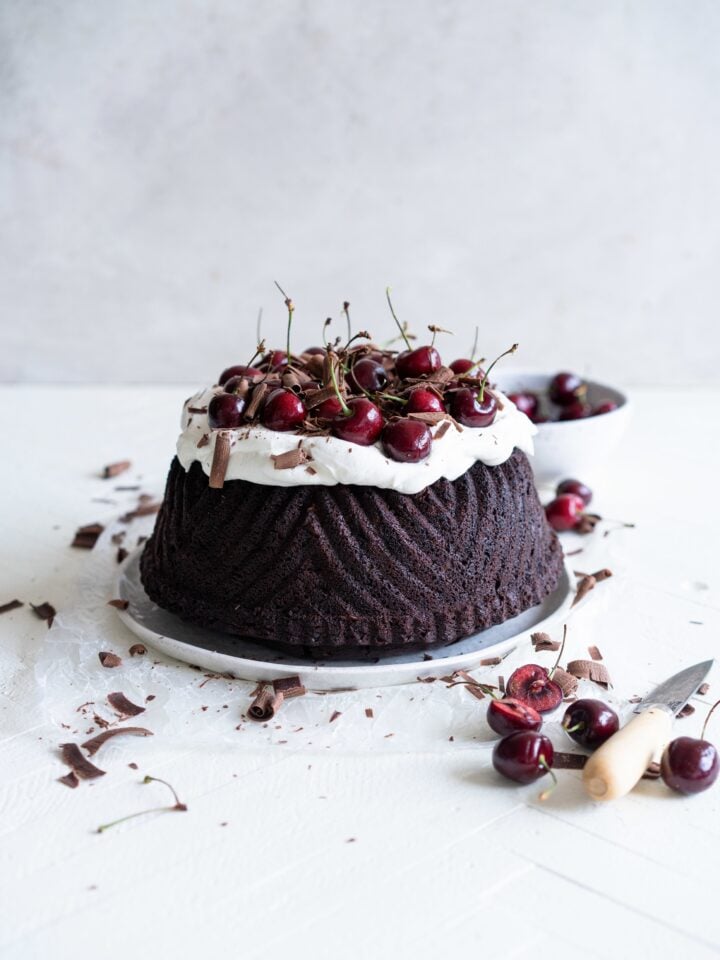 Black Forest Bundt Cake (Chocolate Cherry Bundt Cake with Whipped Cream and Cherries)