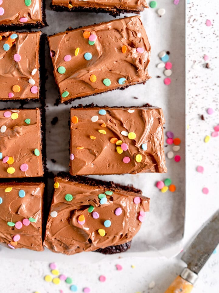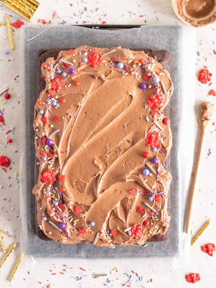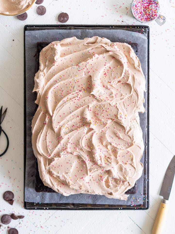 Chocolate Brownie Sheet Cake with Chocolate Hazelnut German Buttercream